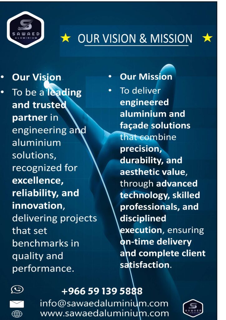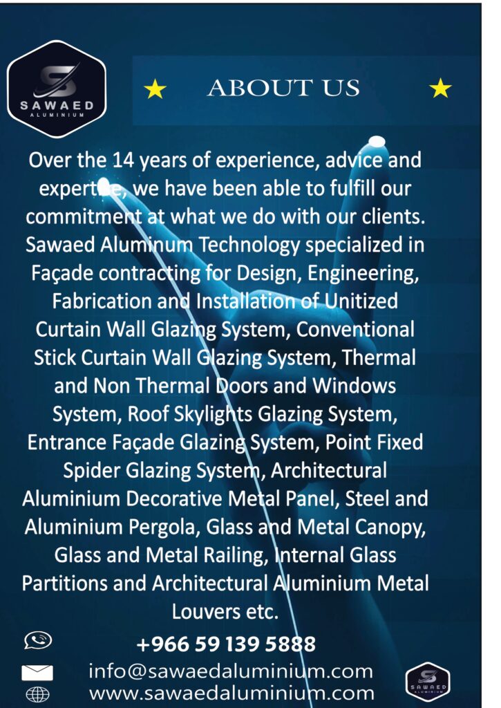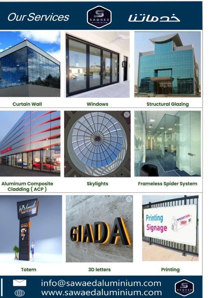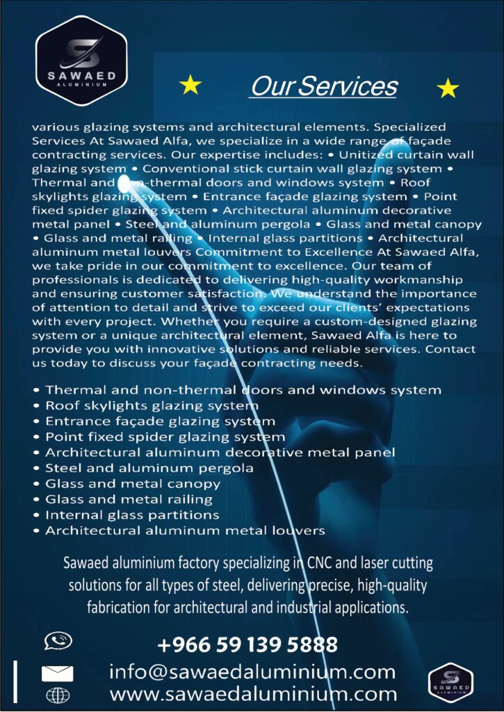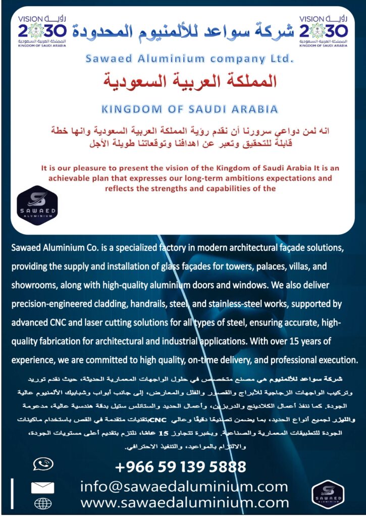 HOME ABOUT US OUR SERVICES CNC & LASER PROJECTS QUALITY & SAFETY CONTACT US HOME ABOUT US OUR SERVICES CNC & LASER PROJECTS QUALITY & SAFETY CONTACT US Sawaed Aluminium Co. provides professional architectural façade, aluminium, glass, cladding, and CNC & laser cutting solutions in Saudi Arabia. With 15+ years of experience, we deliver high-quality workmanship, on-time execution, and reliable engineering solutions for residential, commercial, and industrial projects. Search Search